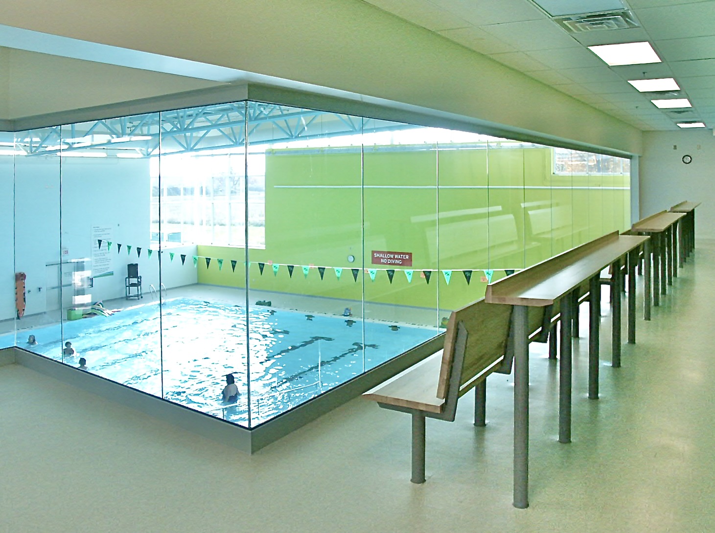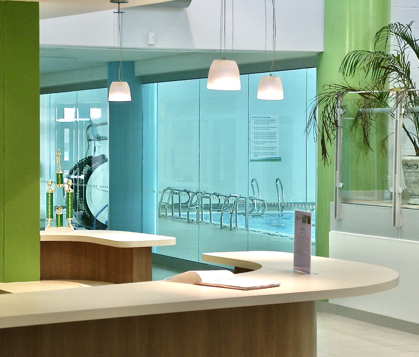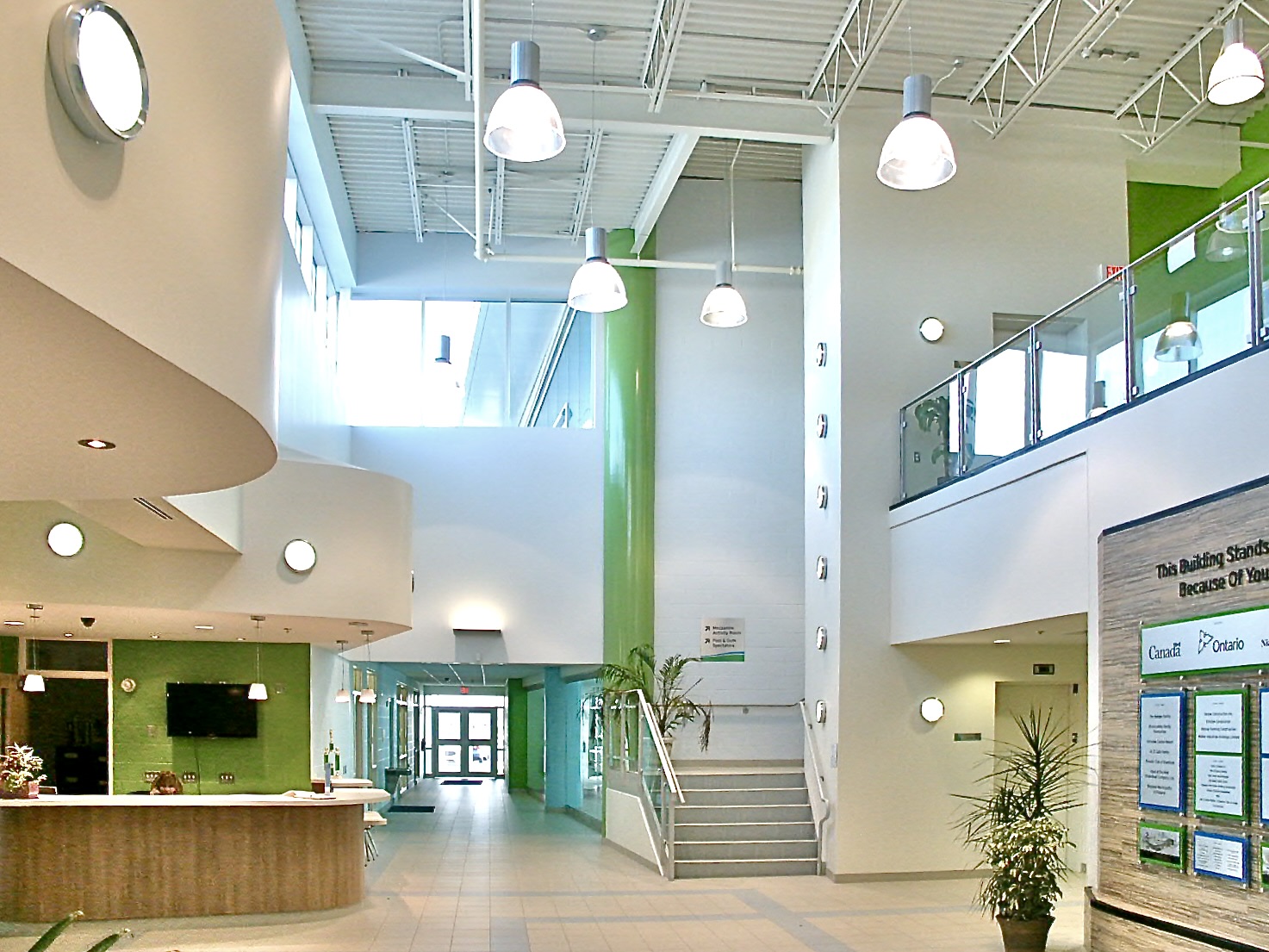 This new 40,000 sq. ft. facility replaced an aging but well-used facility in the downtown core, serving primarily children as well as community user groups of all ages. The building features a 6-lane competition pool with barrier-free access ramp and aqua aerobics instruction area, a full-size gymnasium with sprung wood floors, a multi-purpose Teen Centre with Sound Editing and Recording Rooms, a Daycare for 32 Toddlers, a Computer Room, a Craft Room, a large Activity Room/Breakfast Hall with adjacent two instructional spaces, a light-duty Commercial Kitchen, a Mezzanine Lounge and various multi-purpose spaces. An administrative wing anchors the main entry, providing a convenient means for monitoring guests and internal activities. Site features include large parking lots on both sides of the facility proximate to side entries into each of the building wings, as well as a broad bus staging and drop-off area at the front of the facility delivering children directly to a sidewalk leading to the front entry.